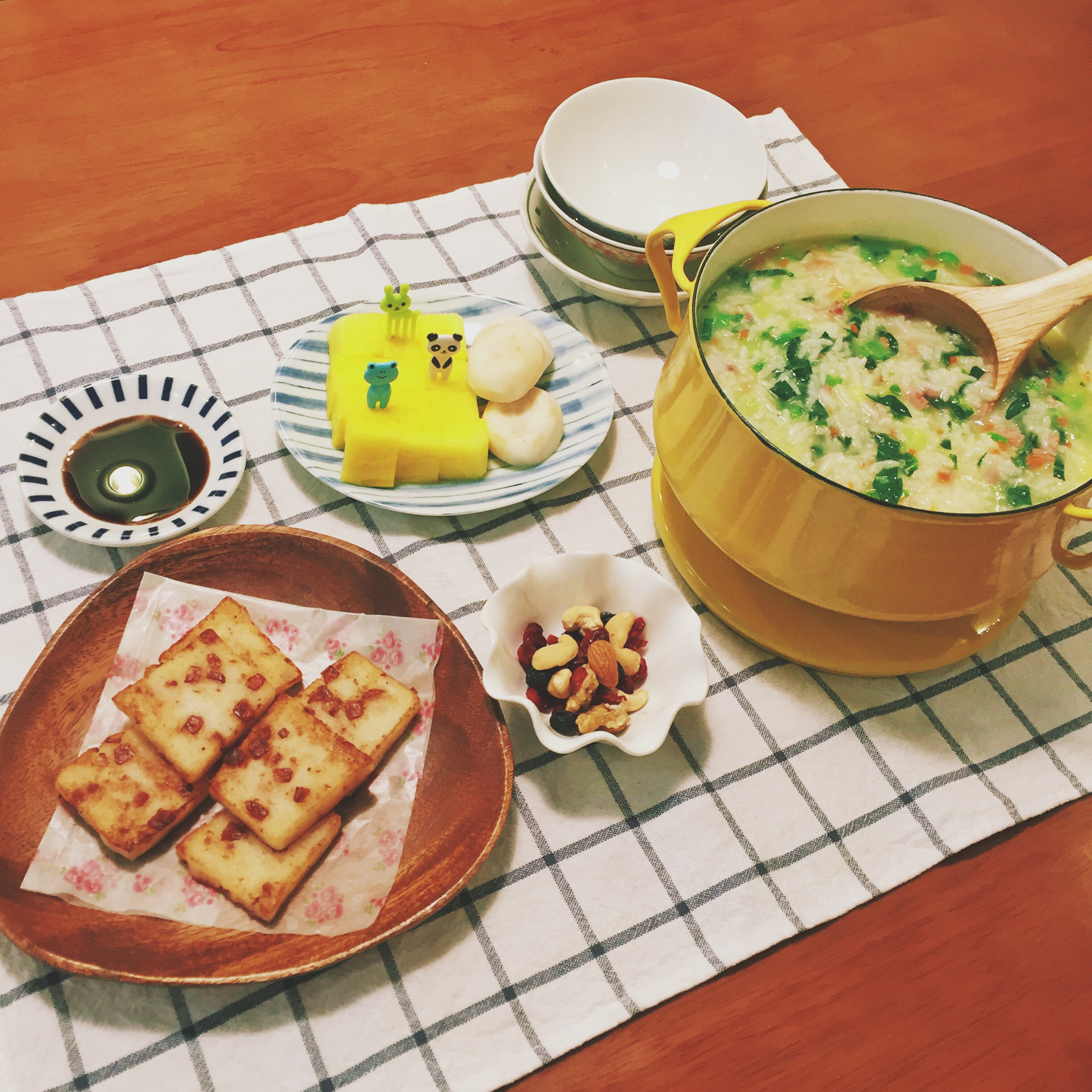 元气菜泡饭,广式腊味萝卜糕,综合果仁,水果是特小凤和荸荠。猫宁~🌞