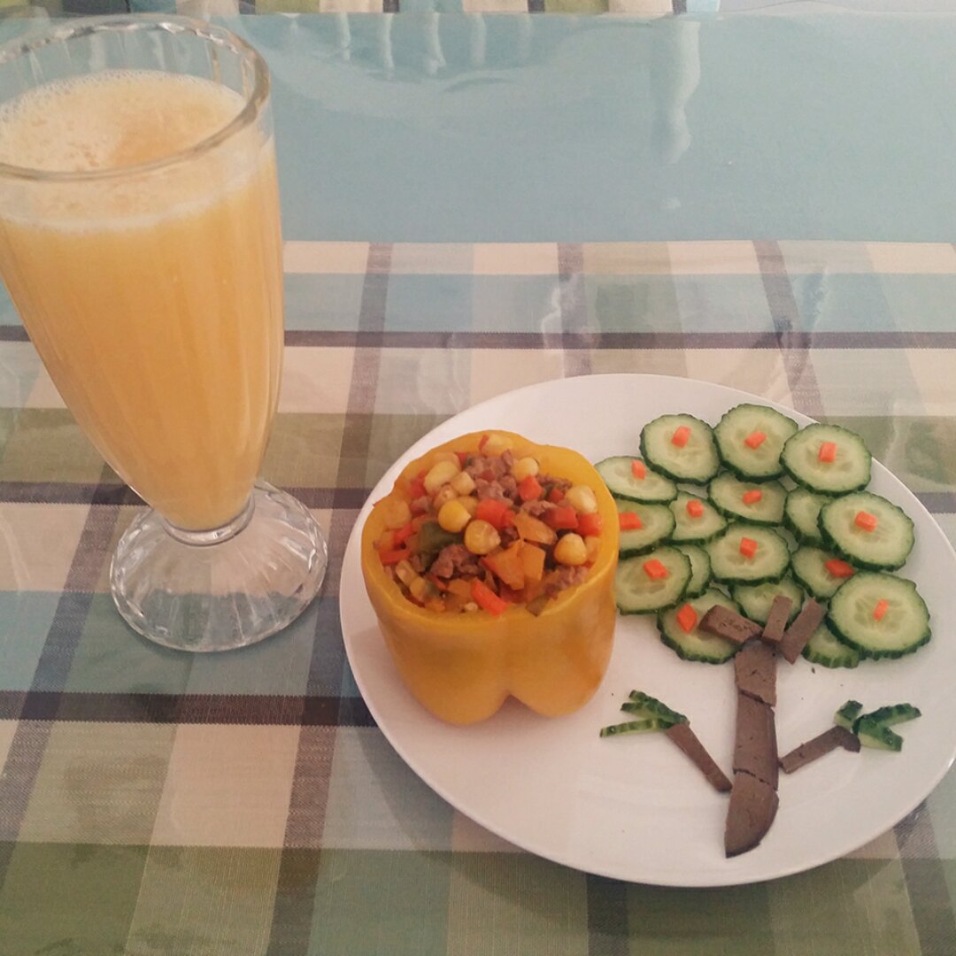 早餐第三天,黄瓜树下的彩椒盏搭配鲜榨甜橙梨汁