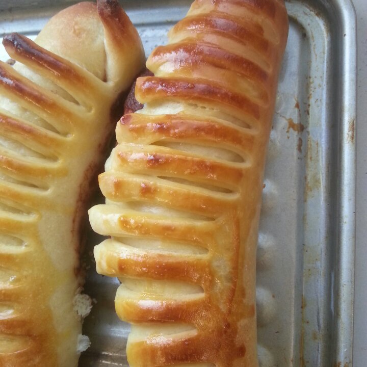 又在深夜里上图,妞也非要帮我写完招牌才睡。一排小猪样的排包葱香十足,内馅塞了肉松和沙拉酱。上层撒的火腿、葱末和芝麻。一炉...