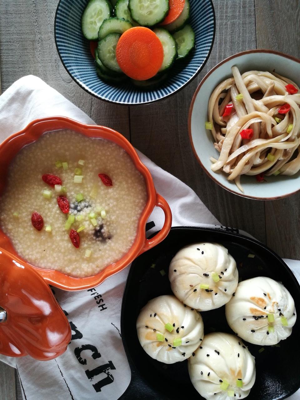 今天吃中餐,生煎包子、海参小米粥、手撕杏鲍菇、浅渍黄瓜胡萝卜[愉快] #早餐•2017年...