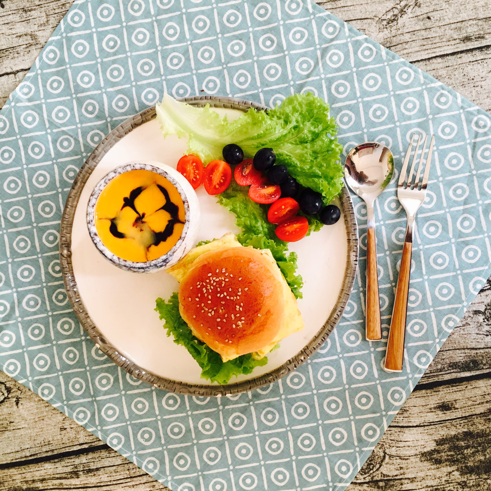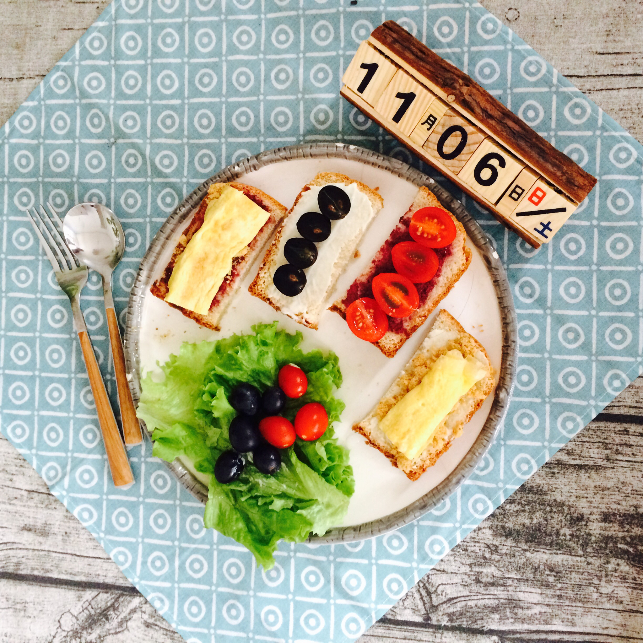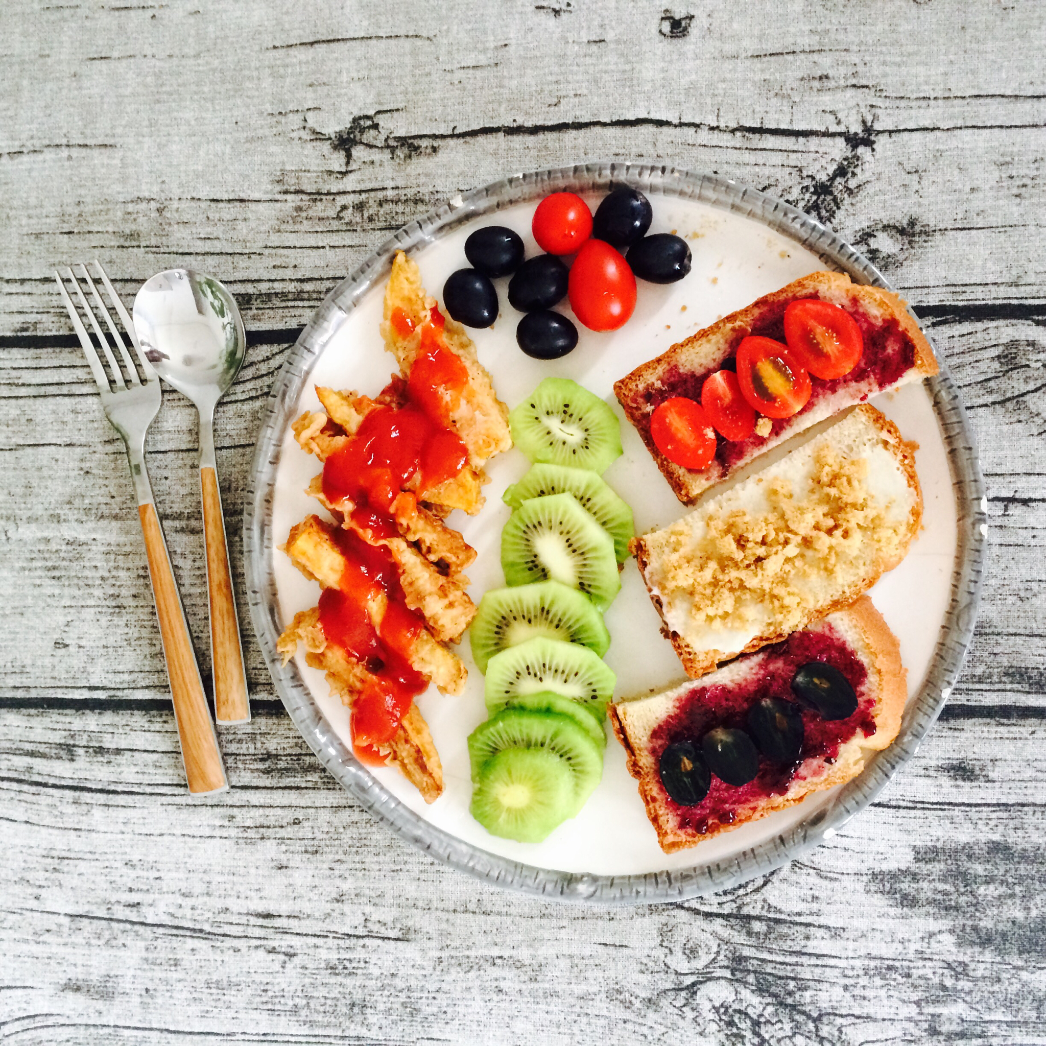 今天是喵爪地瓜,水果蔬菜和饼干,麦片。噢,忘了煎蛋了,let it go。是时候揉个全麦面包啦!