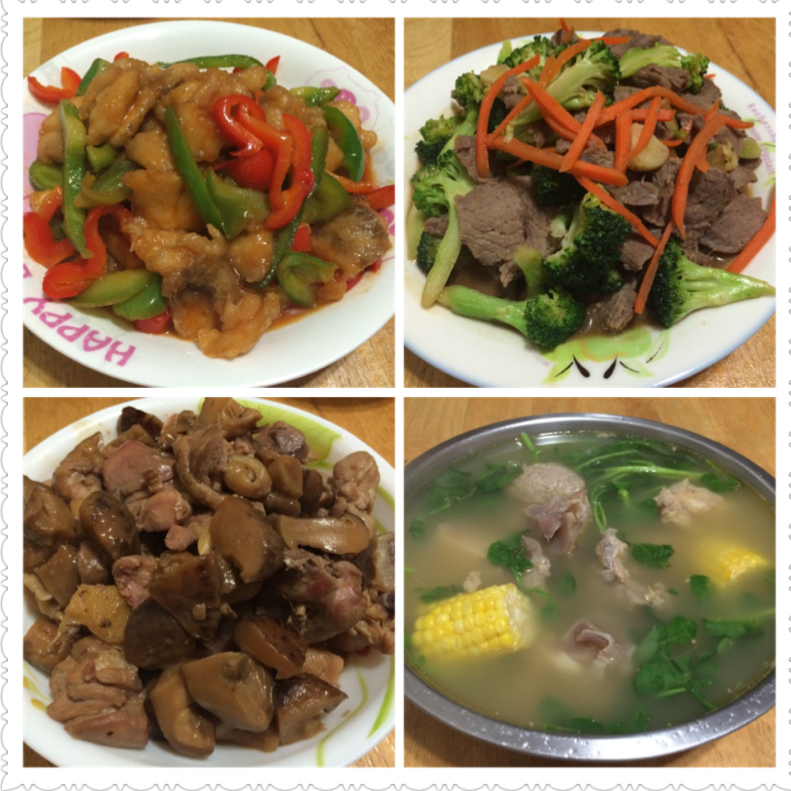 甜酸鱼,芥兰牛,香菇鸡,牛骨汤含有萝卜,番茄,玉米,西洋菜(萝卜跟番茄被我捞掉了)