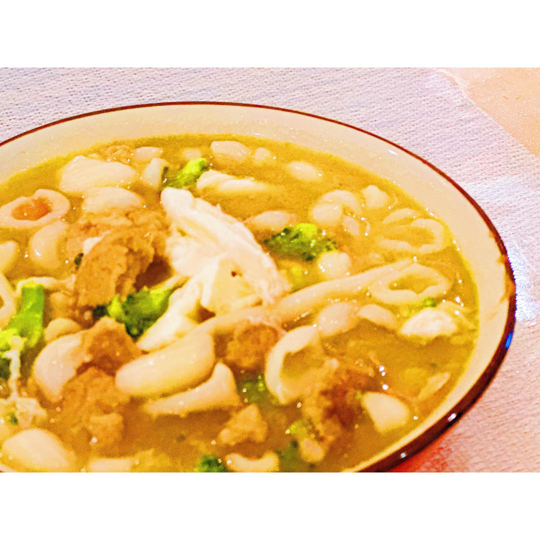 火龙果汁麻食(配菜:肉,木耳,香菇,胡萝卜,西红柿,豆腐,青椒,土豆,油菜,香菜)
