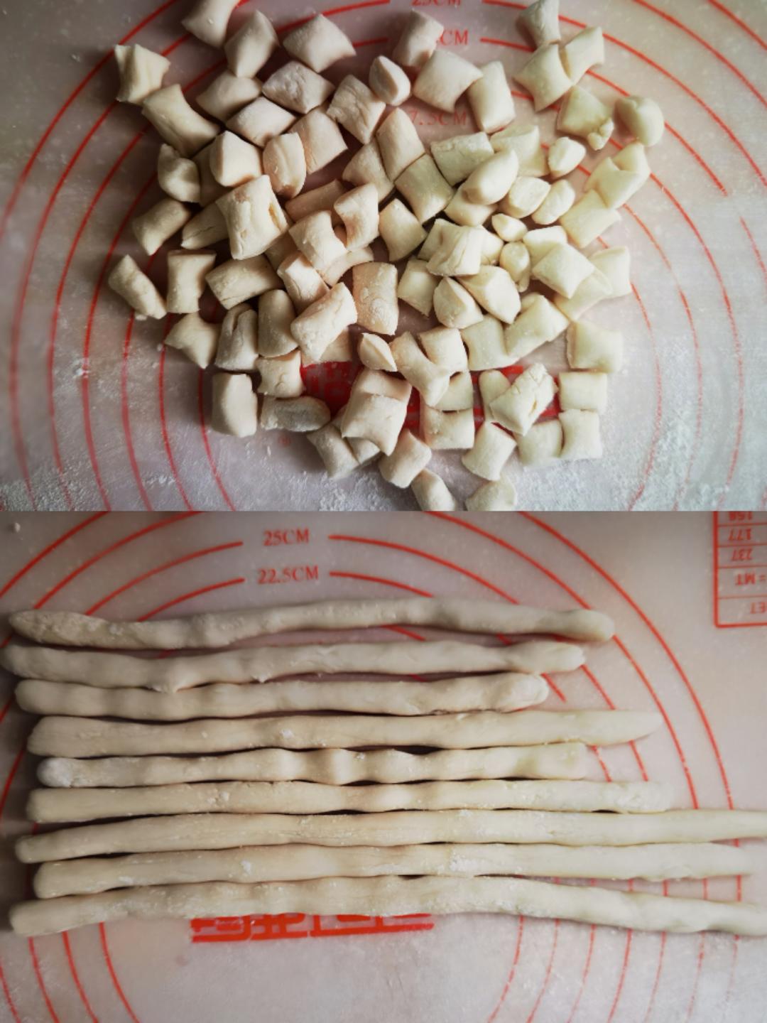 猫耳朵,跟面片相比,猫耳朵的面团更结实,这是因为需要将小面团捏出造型。制作猫耳朵