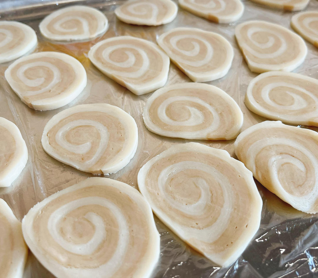 方子很好,口味很接近外面买的。冷冻切片,如果太厚可以垫上烘焙纸,找个圆柱容器压薄,薄一点好吃又容易熟!