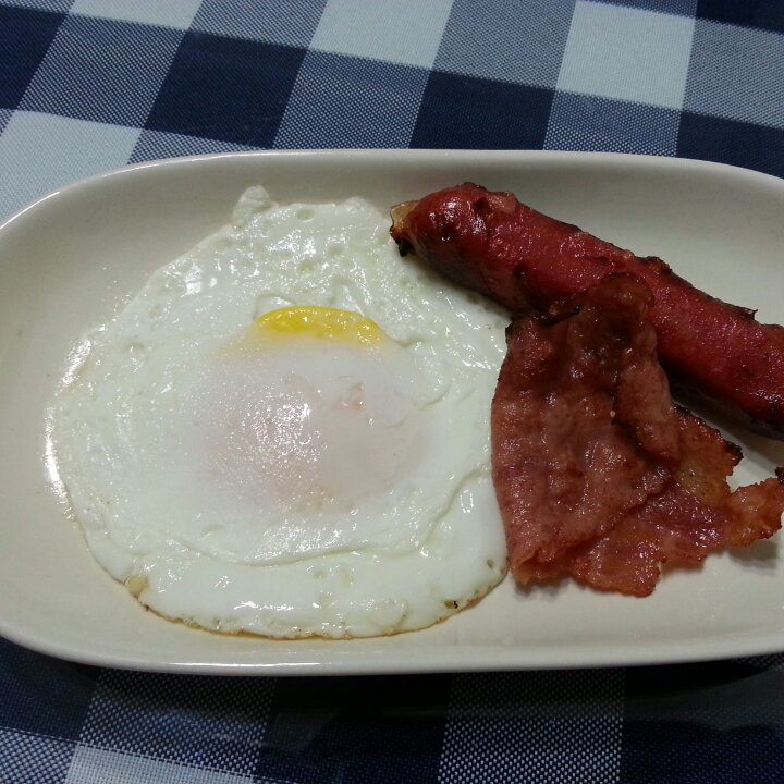 煎蛋、培根、香肠。一早起来弄了这个,诶吗,看起来好暗。。。吃完才想起来,我这还上火呢,不应该吃煎炸的。。#早餐•2016...