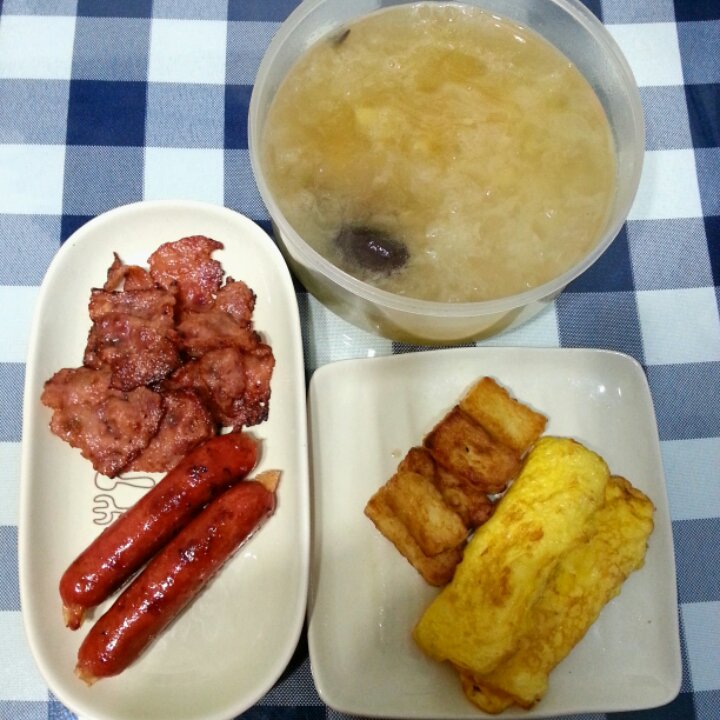 煎培根、香肠,蛋卷,炸鲜奶,银耳红枣莲子百合汤。