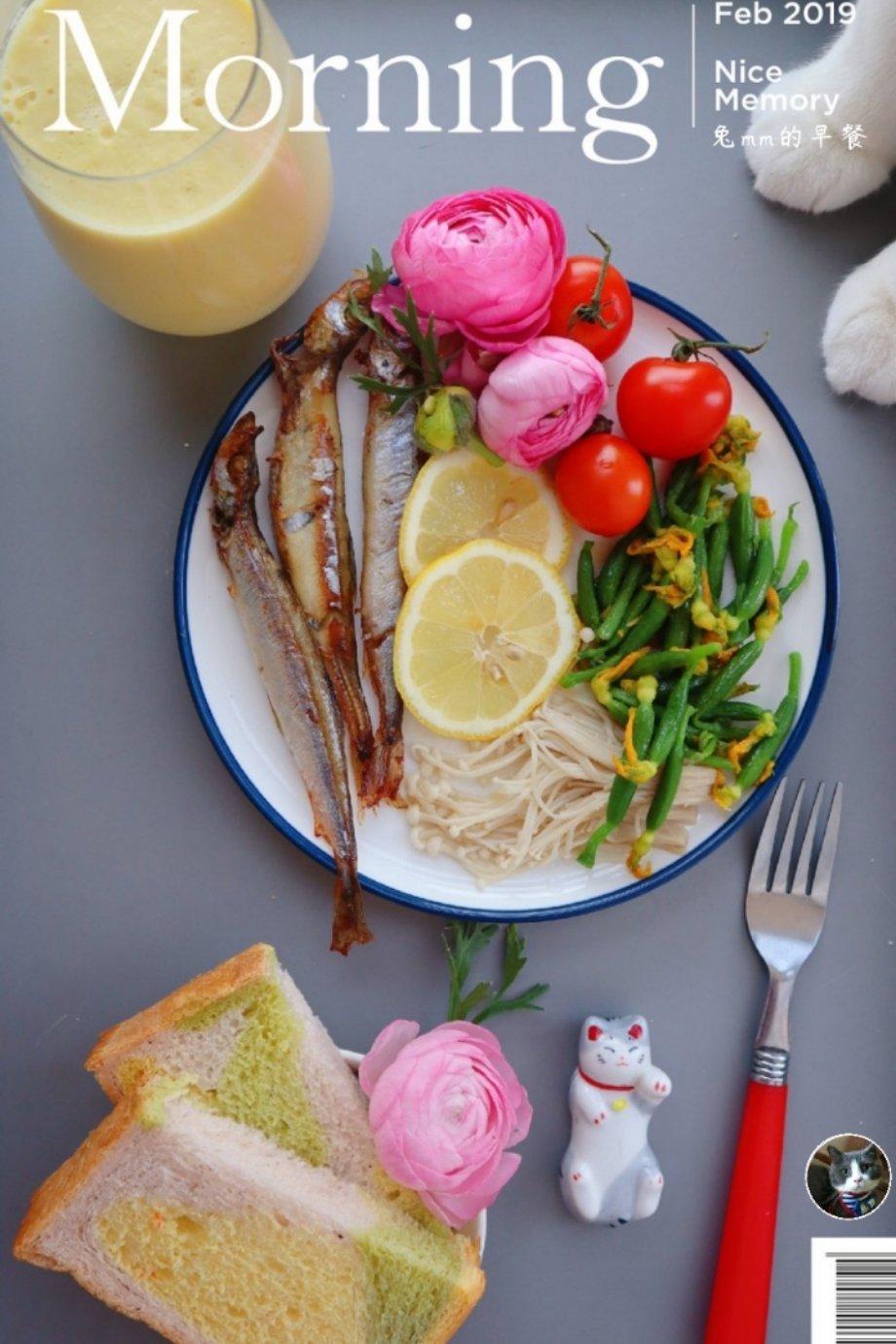 早,玉米汁+果蔬面包+烤多春鱼+金针菇+炒黄瓜苗+番茄+胖胖