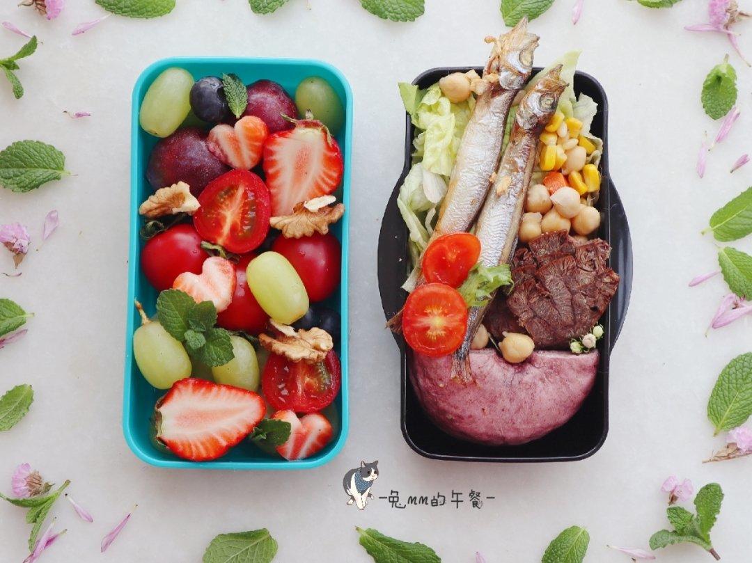 紫薯核桃贝果+蔬菜沙拉+烤多春鱼+卤牛肉+水果们+胖