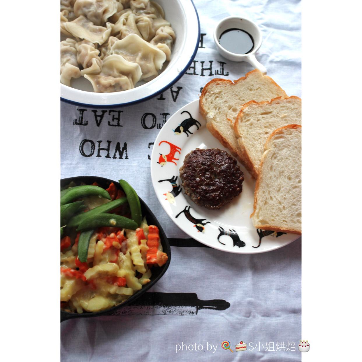 烤土司用烤箱,锅里煎蛋然后做锅贴。