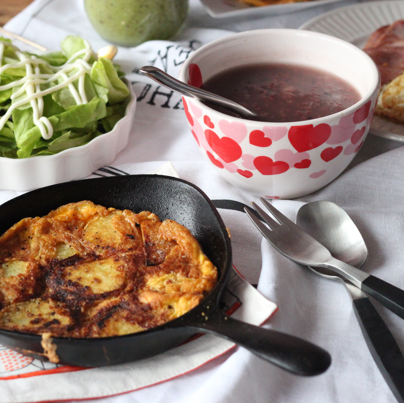 土豆煎蛋+腊八粥+肉肉荷包蛋,蔬菜沙拉不可少,缺了坚...