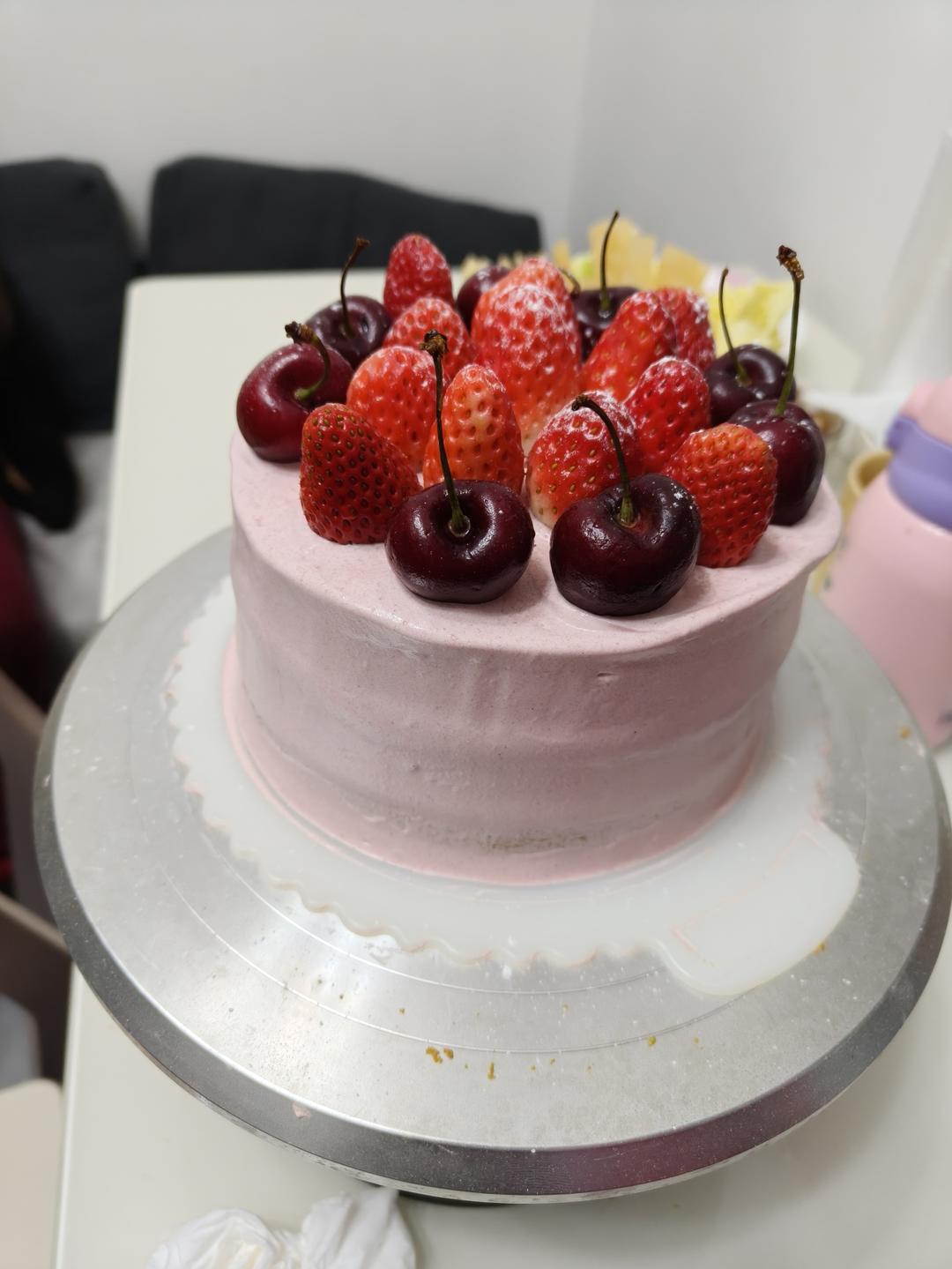 六寸戚风加了羽衣甘蓝粉,草莓夹心,和了红曲粉的奶油抹面,奶油没选好,抹完就肉眼可见的坍塌,留存的首照还算可以 #手作蛋糕...