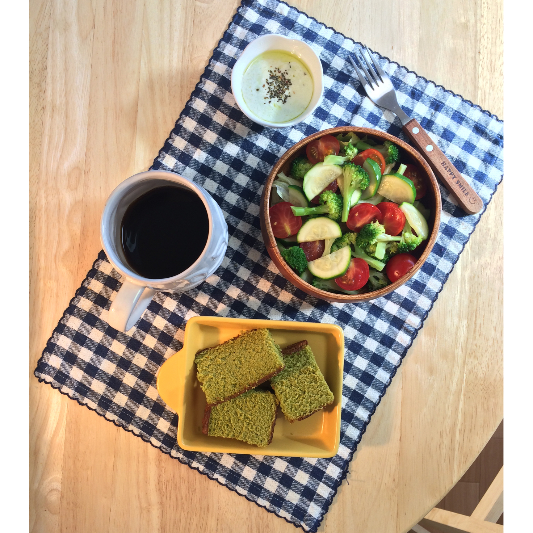 【抹茶味长崎蜂蜜蛋糕+西葫芦番茄西兰花沙拉配酸奶罗勒酱】