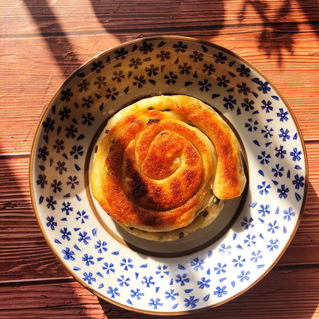 冬日暖阳下的“早餐”😜外焦里嫩的葱花饼配一碗杂粮粥。