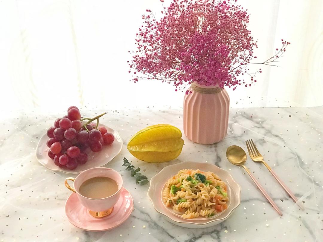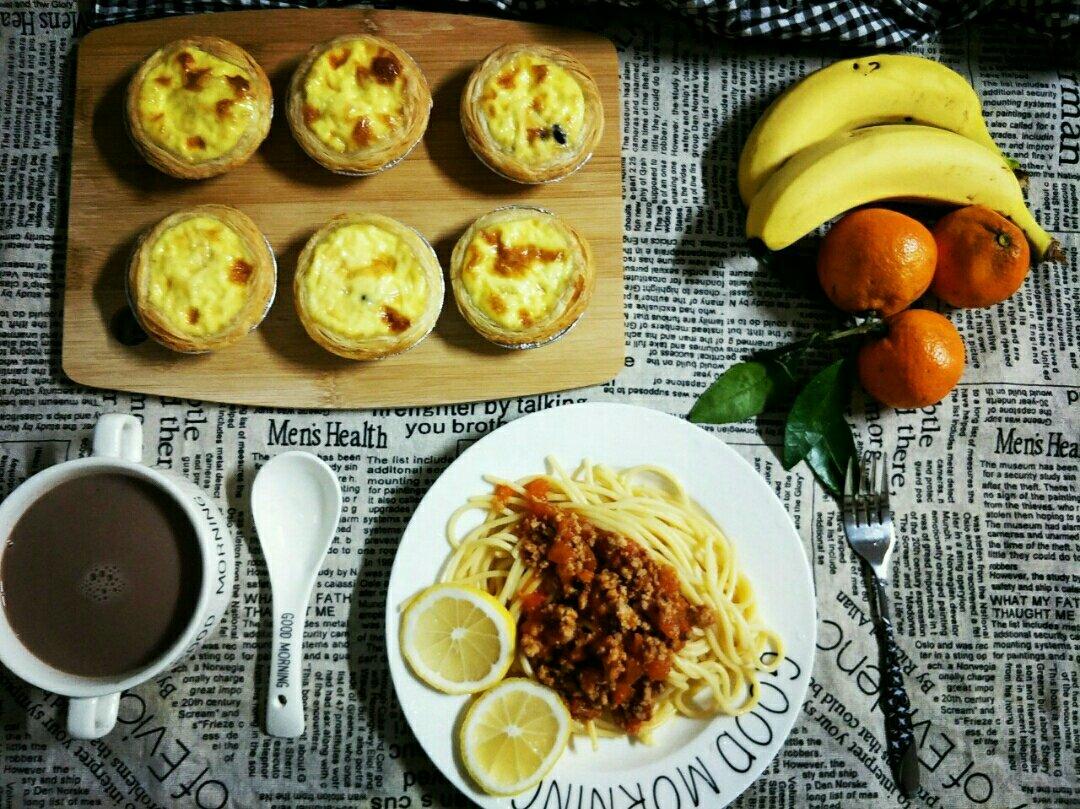 昨晚睡前小朋友突然想吃意面,早起煮了意面,烤了蛋挞,五谷豆浆加水果,雾霾天,心情也要美...