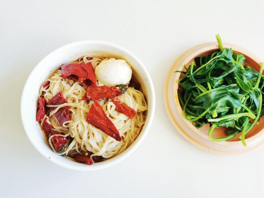 早餐吃个素的辣皮子拌面~鸡蛋 一碗藤藤菜 简单就好