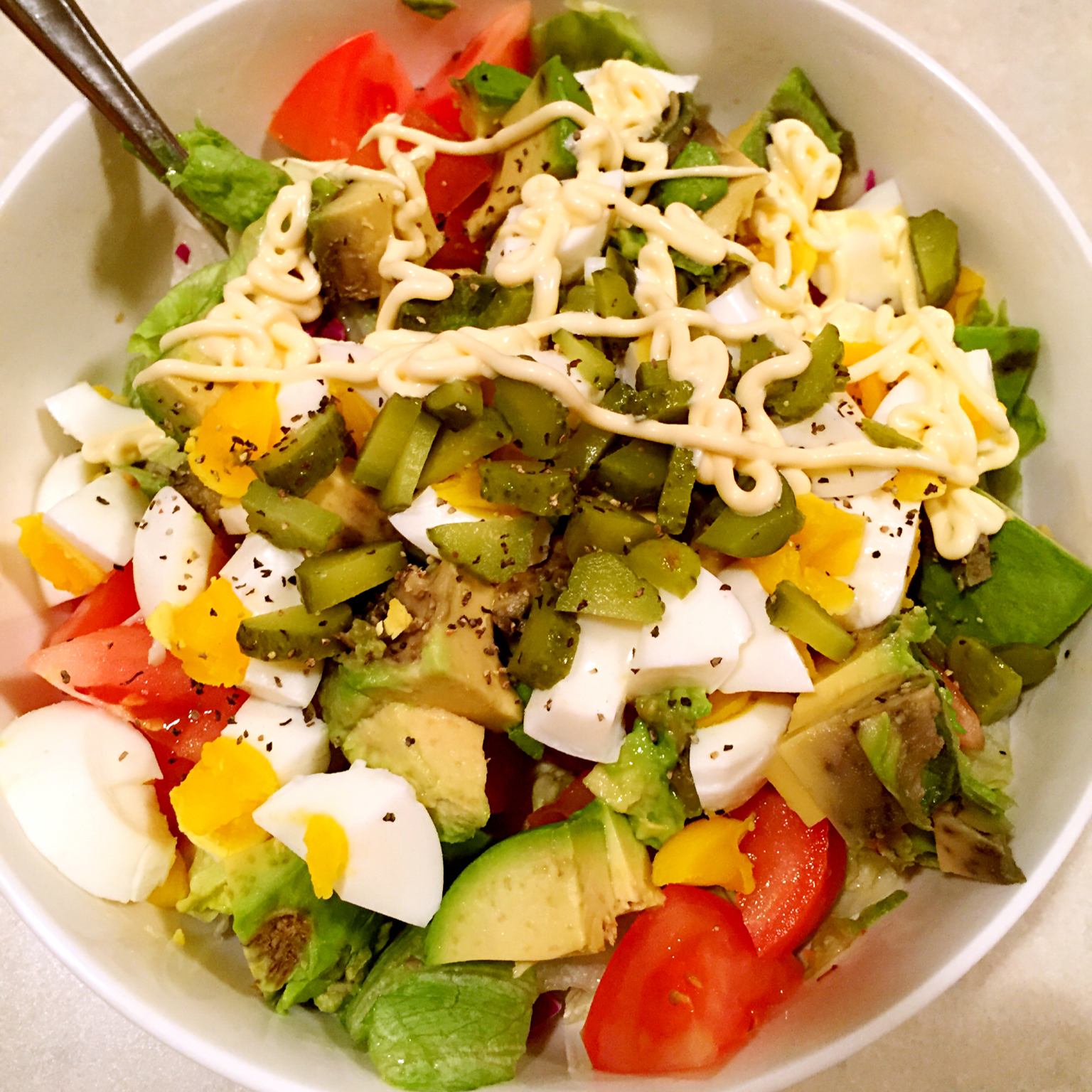 其实牛油果下面放了意大利沙拉酱。我怕老爸觉得淡,给他切了点酸黄瓜。他看着这碗说,没有沙拉酱啊?我只好给他的半球加了蛋黄酱...