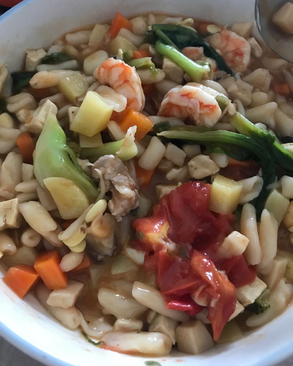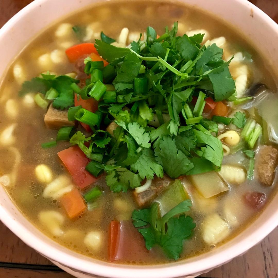 火龙果汁麻食(配菜:肉,木耳,香菇,胡萝卜,西红柿,豆腐,青椒,土豆,油菜,香菜)