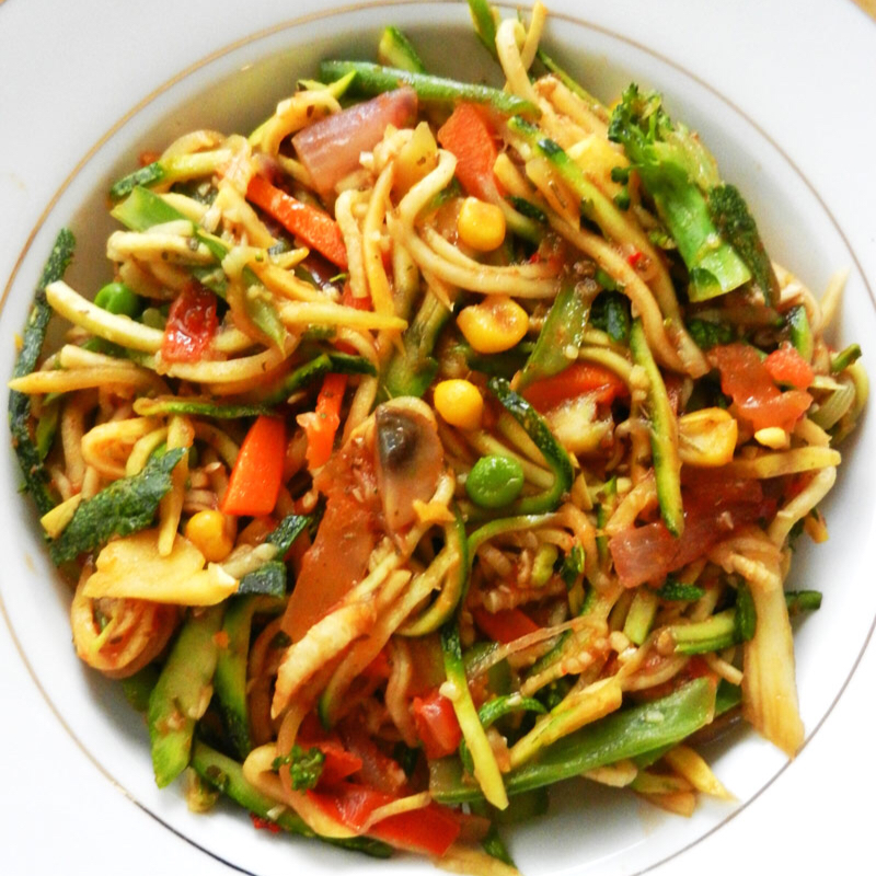 炒面,西葫芦胡萝卜蘑菇玉米粒西兰花,什么都可以放,五颜六色还挺好看的