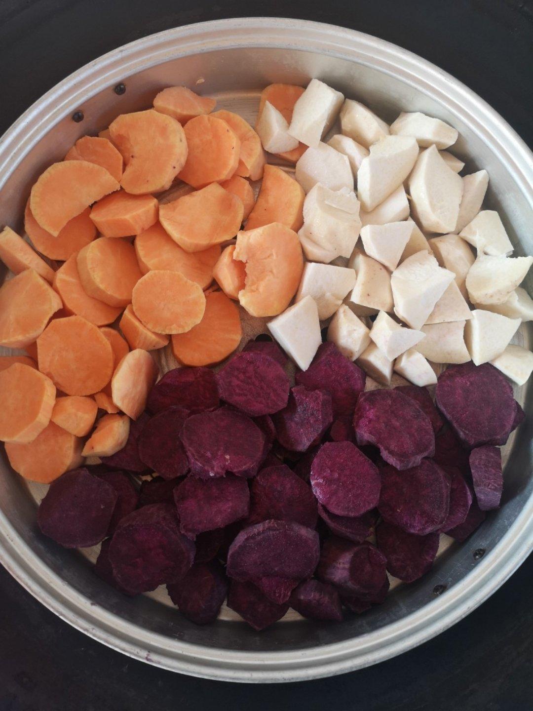 紫色用紫薯白色用芋头都OK ,只是黄色用了南瓜,蒸出来太湿了,用了很多木薯淀粉,导致煮出来太Q弹啦。后来看到另一个方子,...