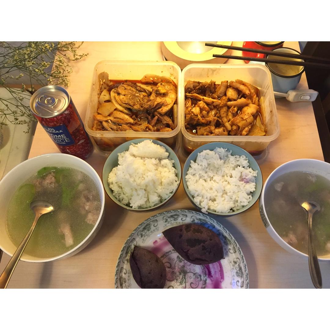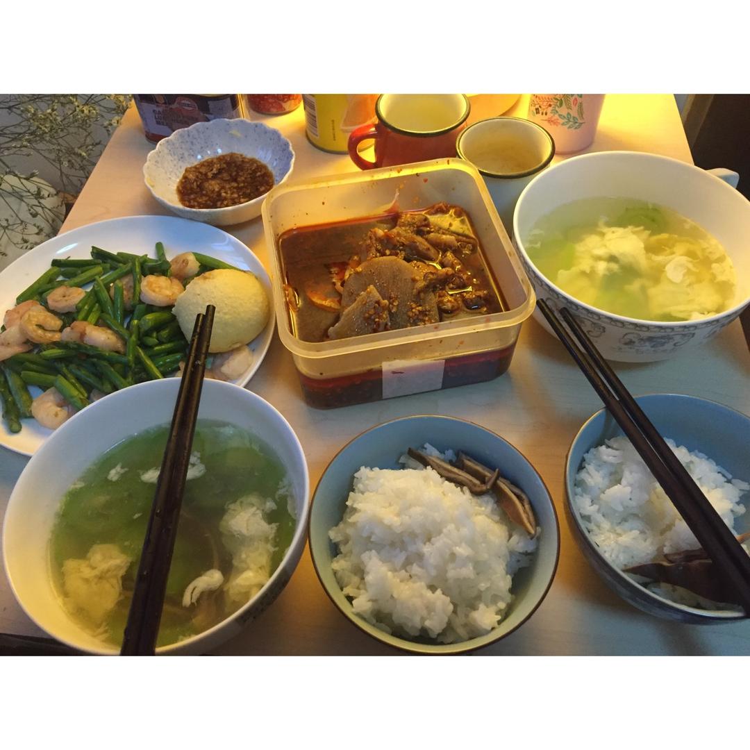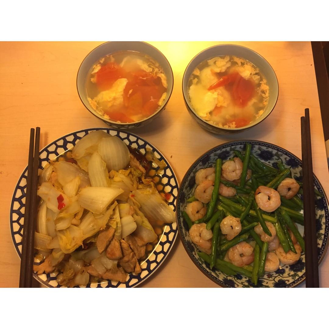 因为下午来大姨妈所以江小厨下班特意回来给我做了晚餐,超美味哦。芦笋虾仁春意盎然,娃娃菜炒肉是江小厨拿手菜,还加了两碗番茄...