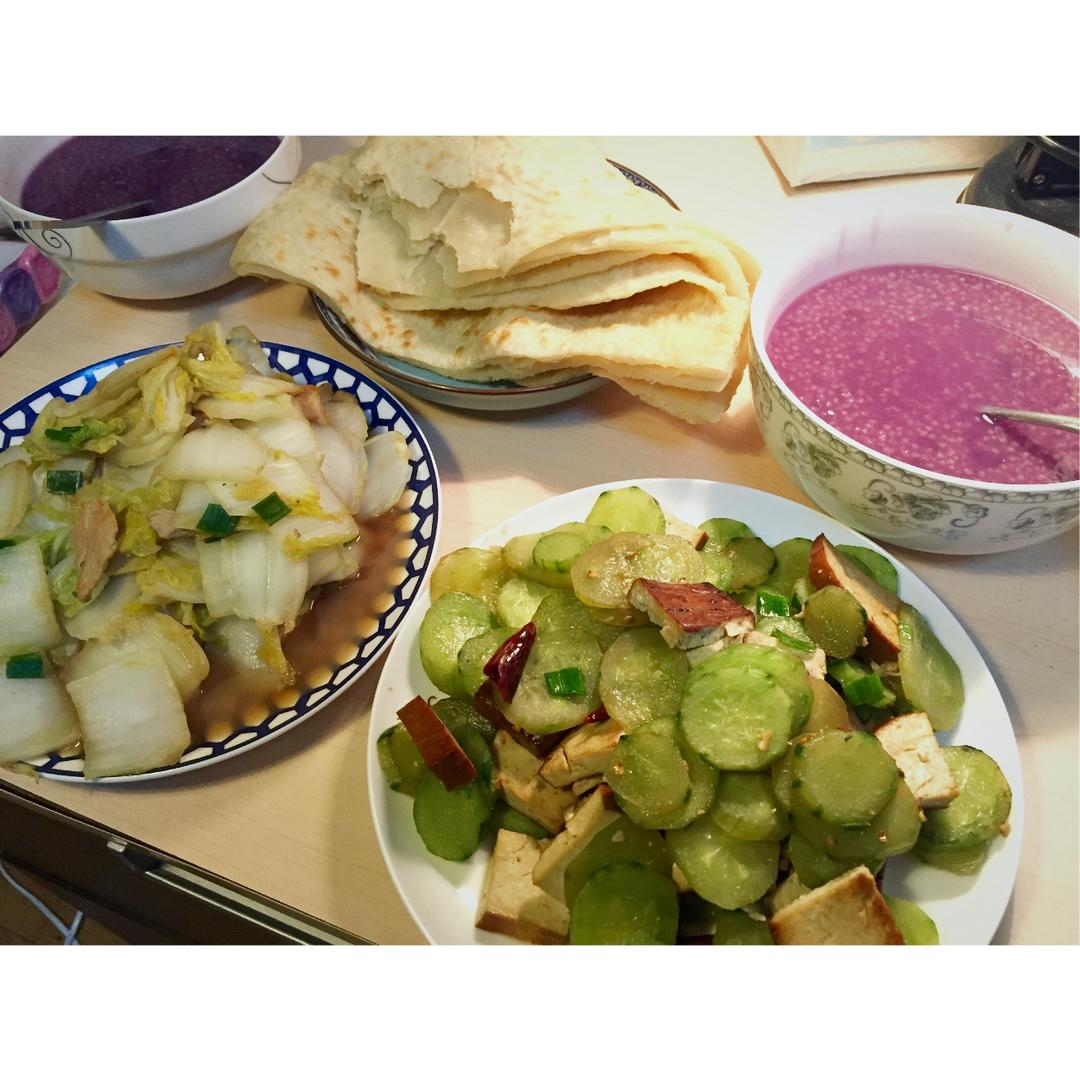 好久没见,江小厨今天做了两个快手菜,黄瓜炒香干和娃娃菜炒肉,量太大吃不了😂我开发了紫薯小米粥,颜色美丽! #晚餐•201...