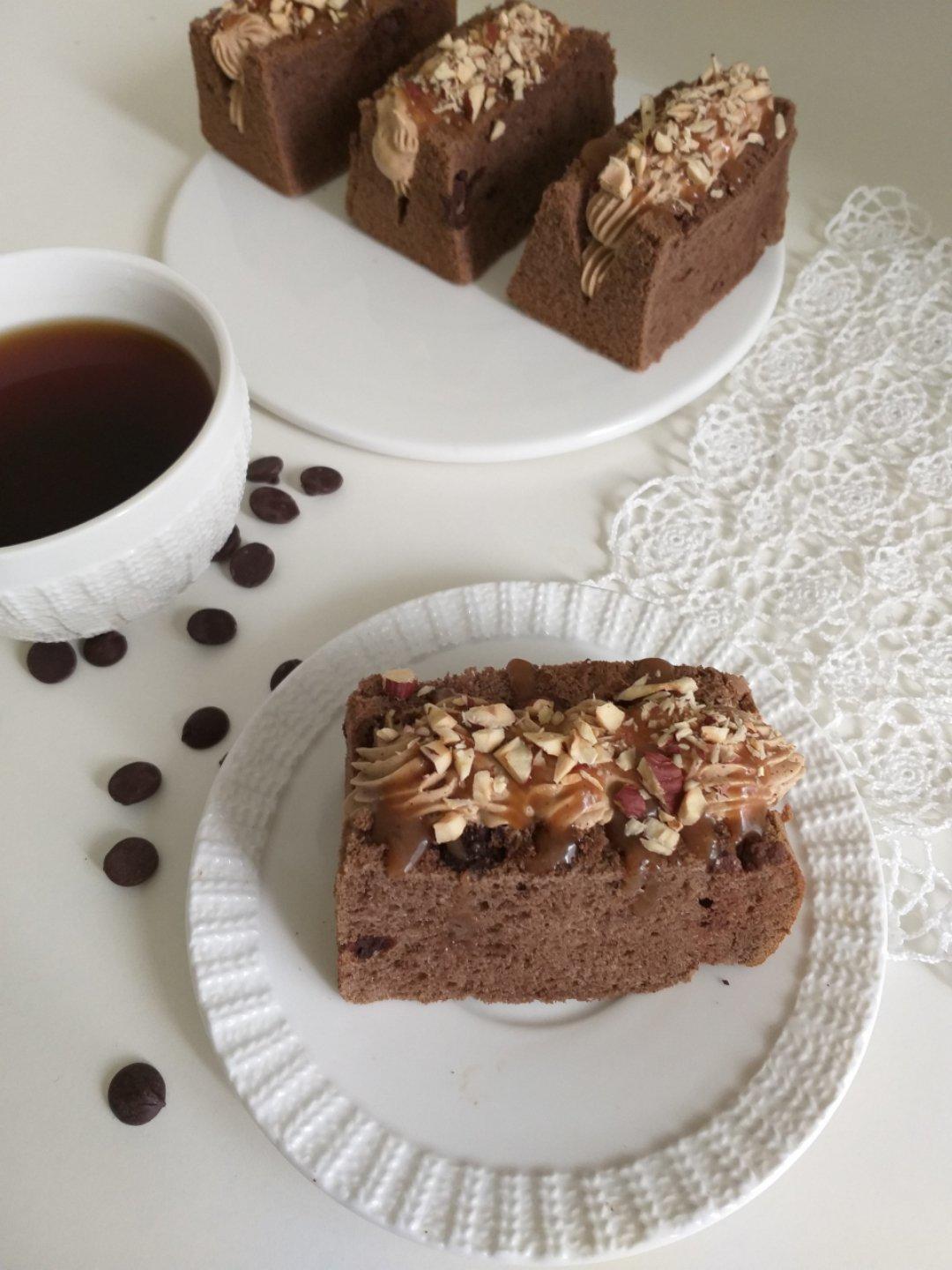 #摩卡戚风# 一个人的下午茶…摩卡戚风,咖啡奶油,太妃酱,坚果碎,钩针,蕾丝花片,伴着Adultchild的Sad Th...