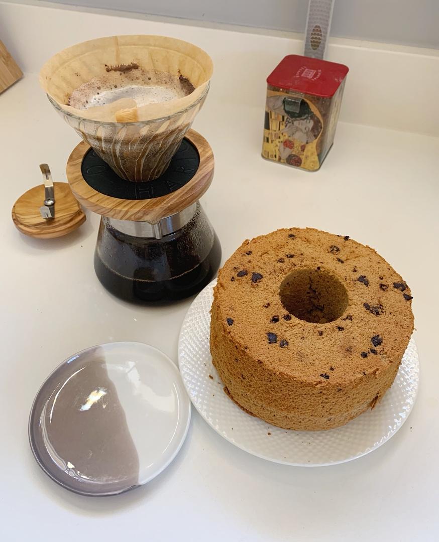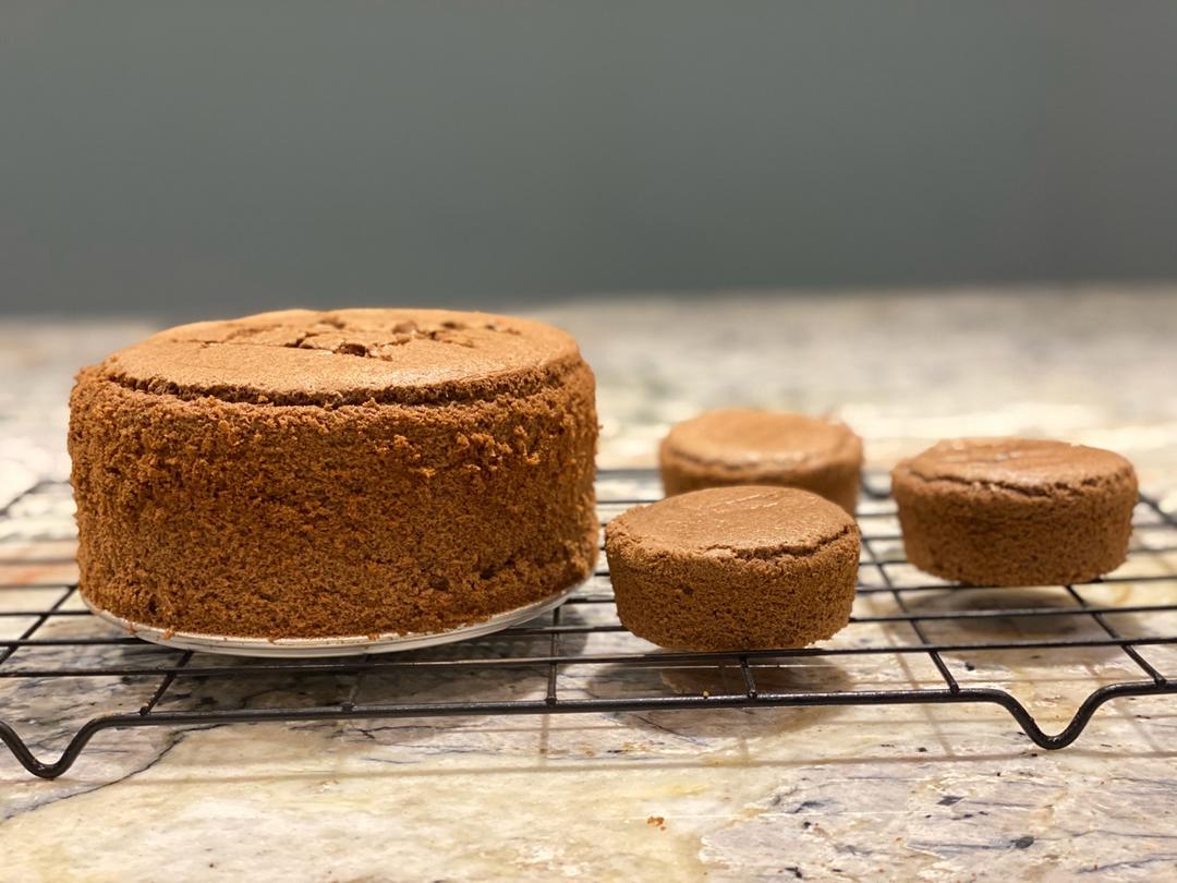 摩卡戚风,第一次做。原配方7寸按0.74的比例调整为6寸,不喜欢太甜,糖减为60克,鸡清用了4个,蛋黄用了3个,白醋改为...