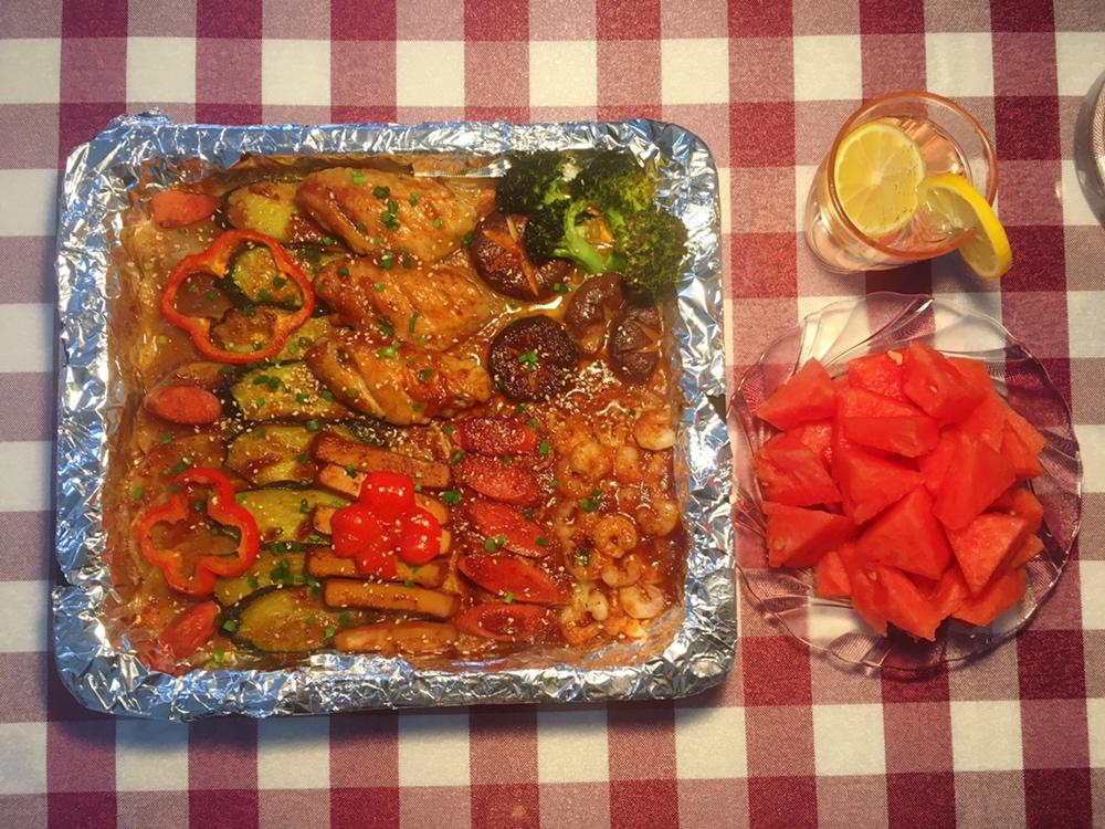 不知道可不可以先把材料放在袋子里,然后倒酱汁进去,摇晃均匀,再摆盘烤,这样的话比刷酱料应该简单一点,而且不会破坏摆盘🤔