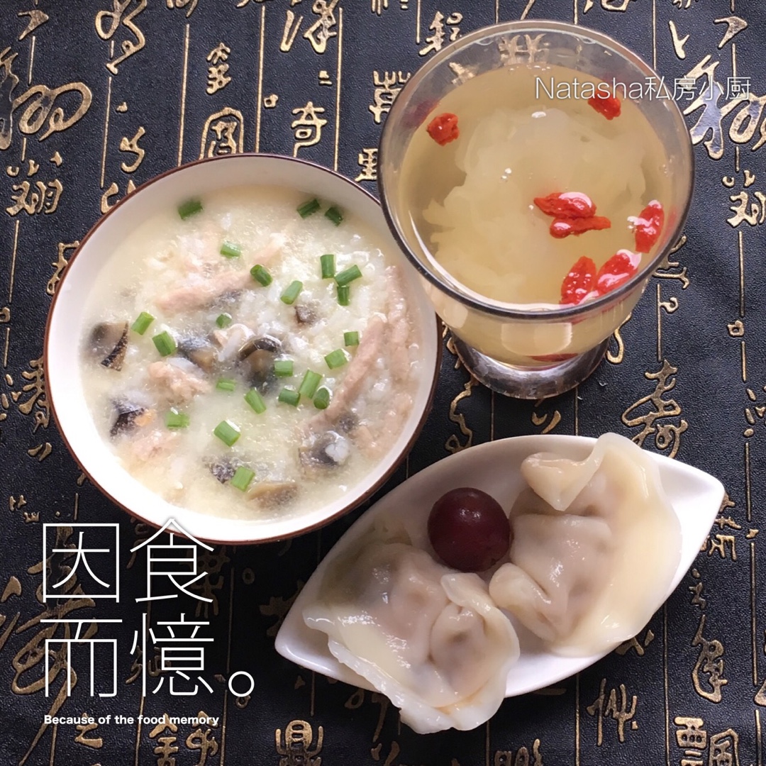 周五的早餐:枸杞银耳雪莲子、皮蛋瘦肉粥、水饺