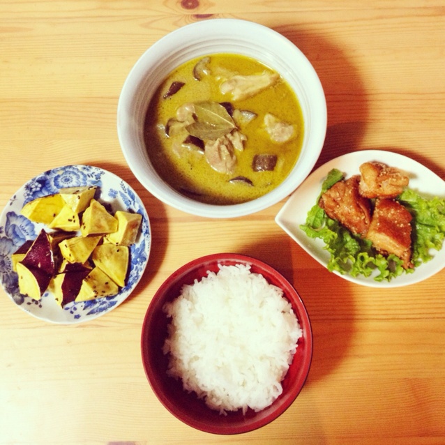for him。泰国绿咖喱,快手唐揚げ,大学芋,泰国香米饭。(^。^) 我继续喝汤去了〜〜