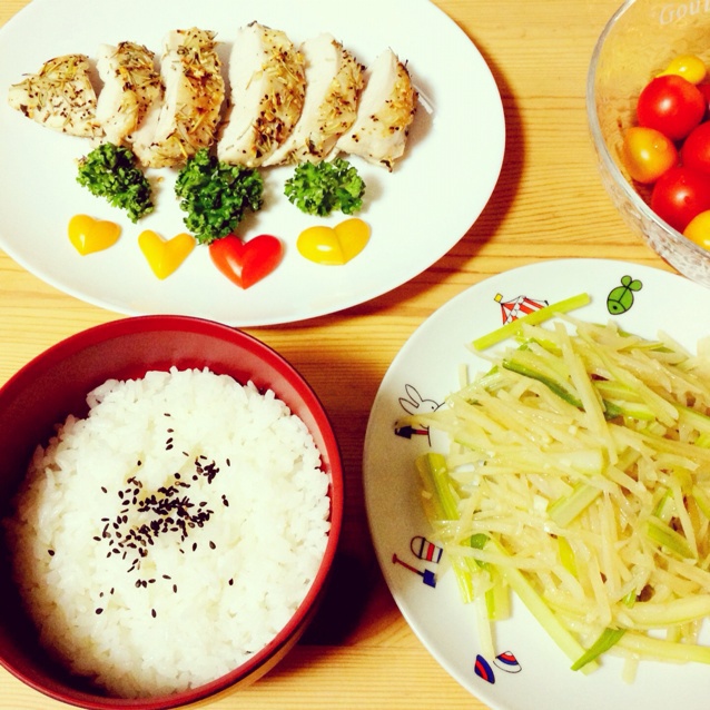 土豆丝炒芹菜丝,烤鸡胸,还有一碟大小不一的迷你番茄