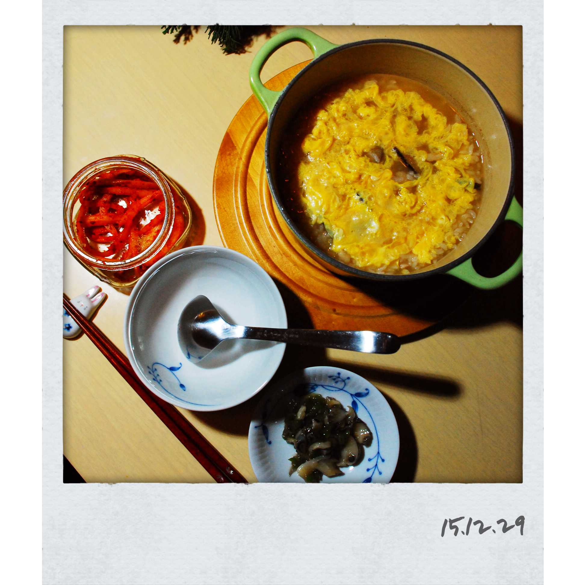 用剩饭做了雑炊。一只鸡腿剔骨切块,加一些松茸片炖煮片刻,加冷米饭煮开吸收水分,最后浇上蛋液关火(焖久了,熟透了😓 半熟的...