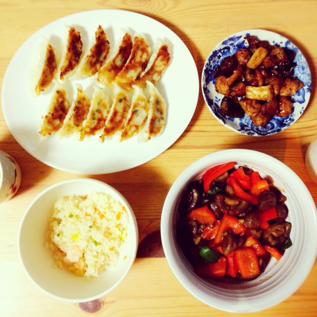 焼き餃子、椎茸と栗の煮付け、焼鳥、エビチャーハン(炒饭是临时买的,怕今晚太咸了(。-_-。)