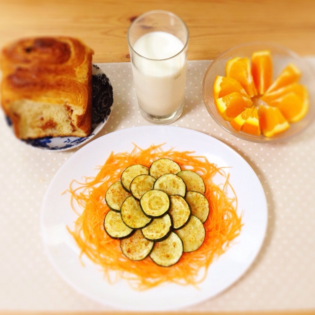 苹果肉桂面包(买的啦),牛奶,煎西葫芦配胡萝卜千切,橙子