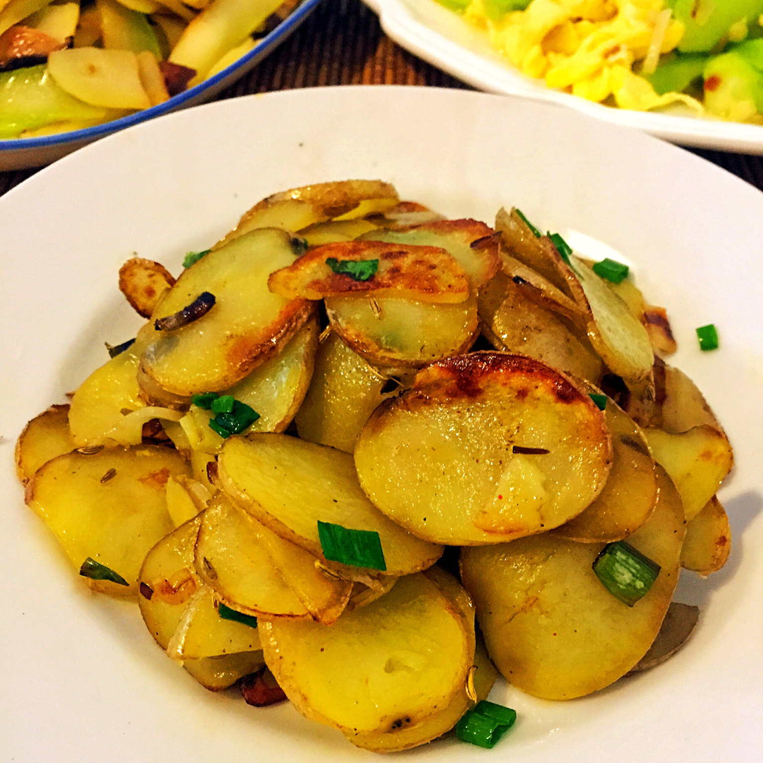 孜然土豆+香菇炒西兰花梗+丝瓜炒蛋
