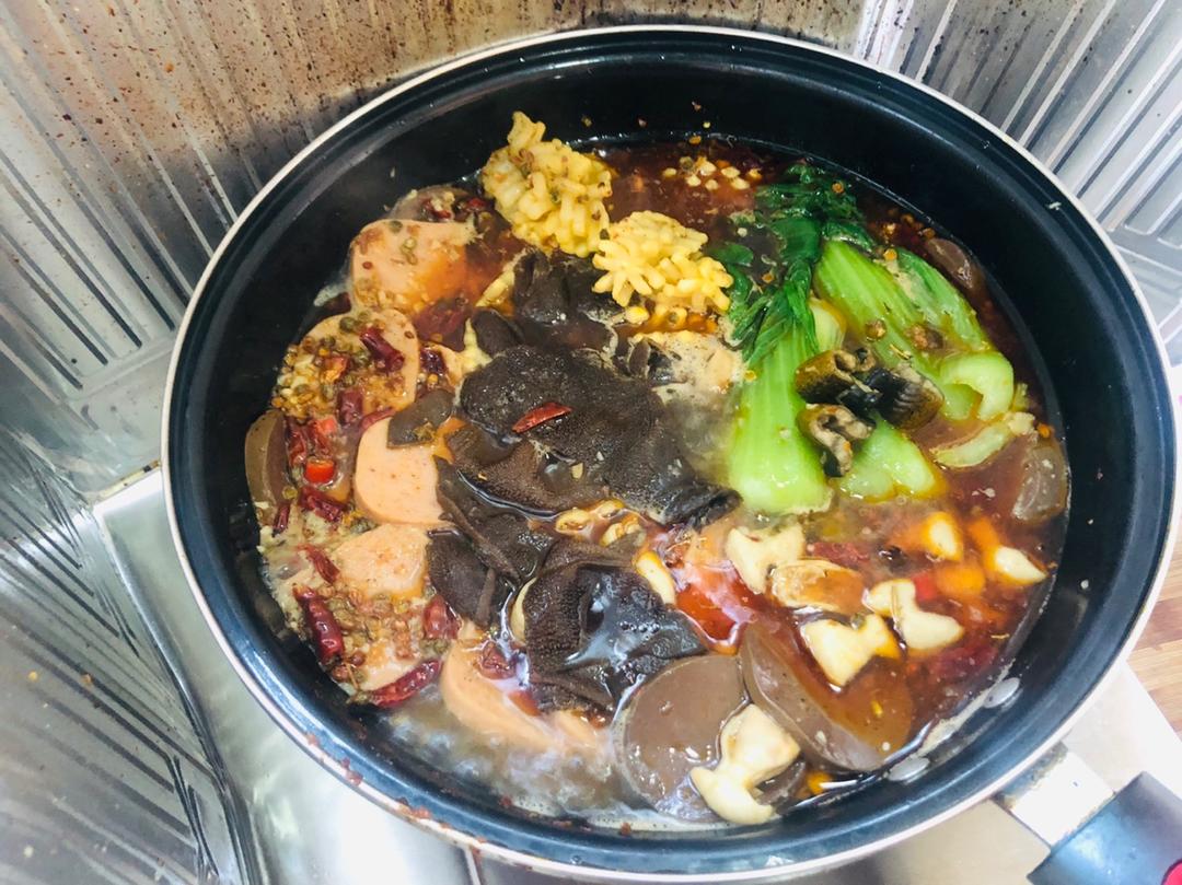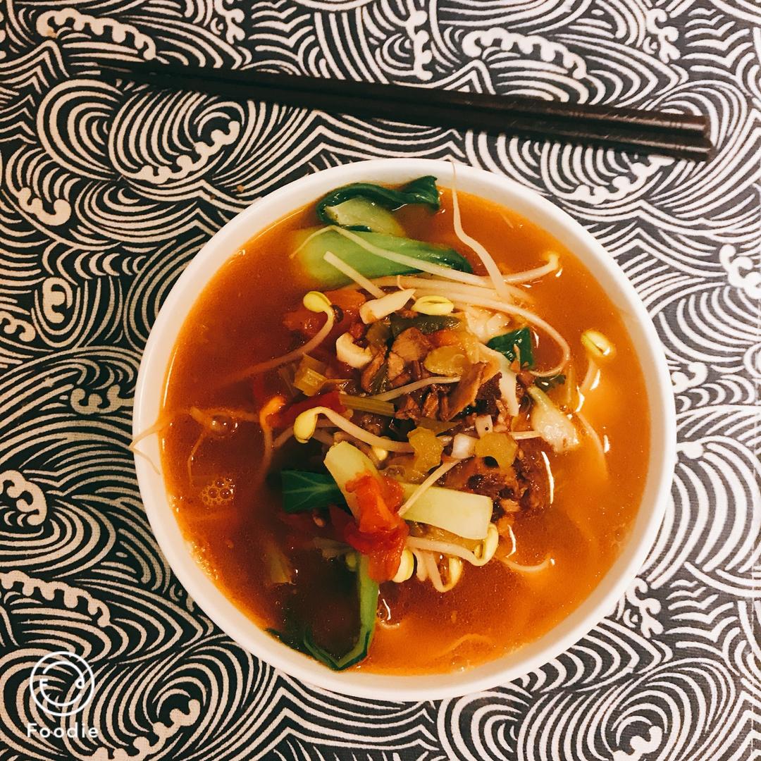 肉臊子、胡萝卜、木耳、黄花菜、口菇、番茄、菠菜,再浇上岐山醋,一锅香...