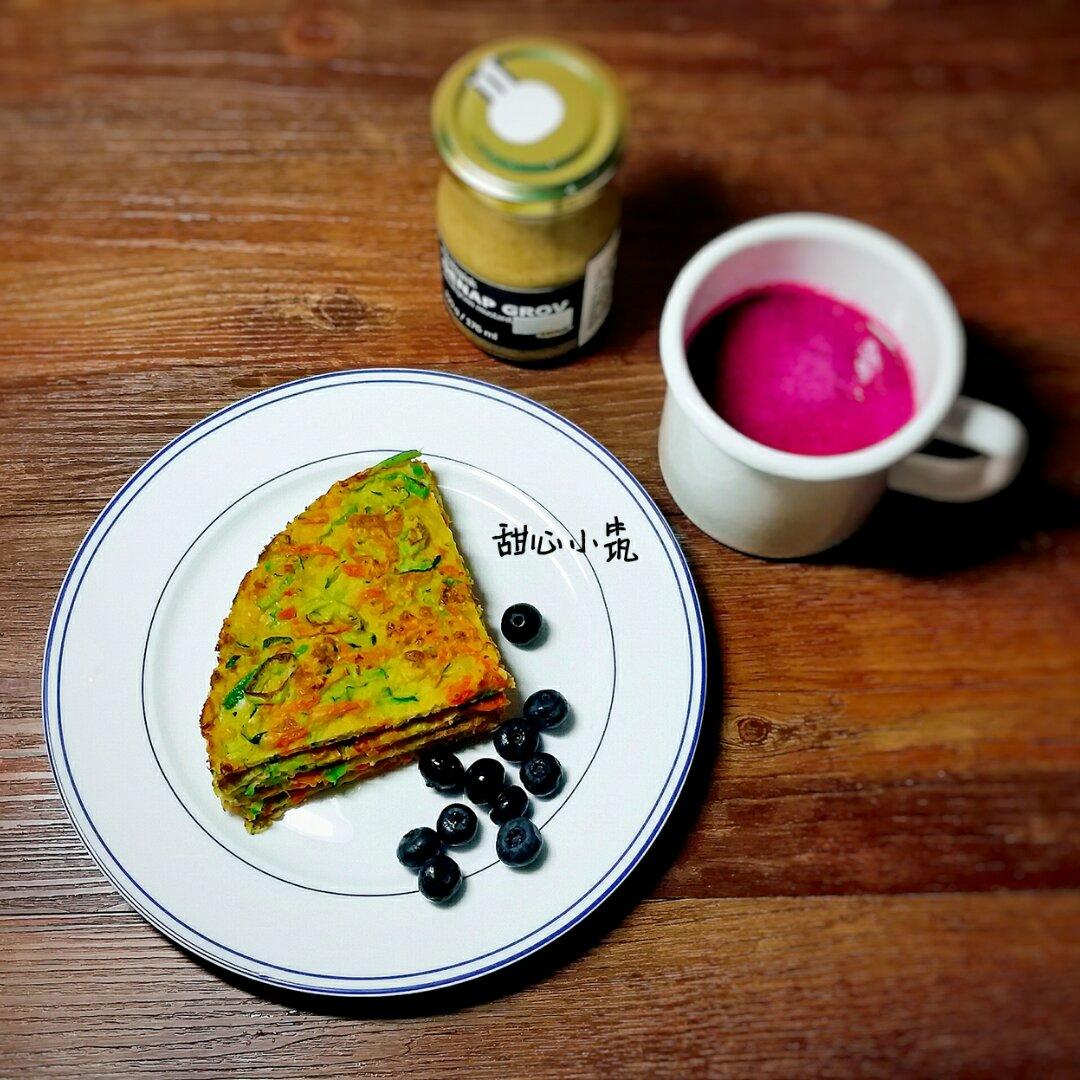 今日早餐:黄瓜胡萝卜蛋饼、蓝莓、火龙果汁