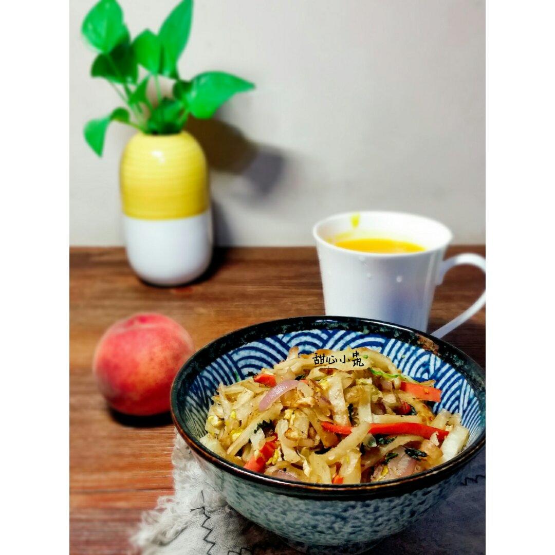 炒饼、南瓜浓汤、桃子