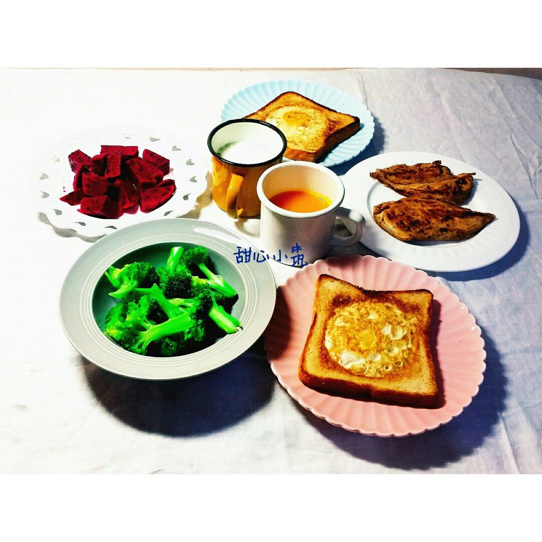 荷包蛋吐司、白灼西兰花、火龙果、煎鸡胸肉、牛奶麦片、南瓜浓汤...