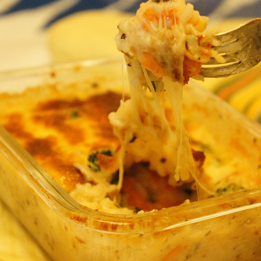 熬了个稠一点的当酱汁做了焗饭 铺了厚厚厚厚一层马苏里拉 哇咔咔...