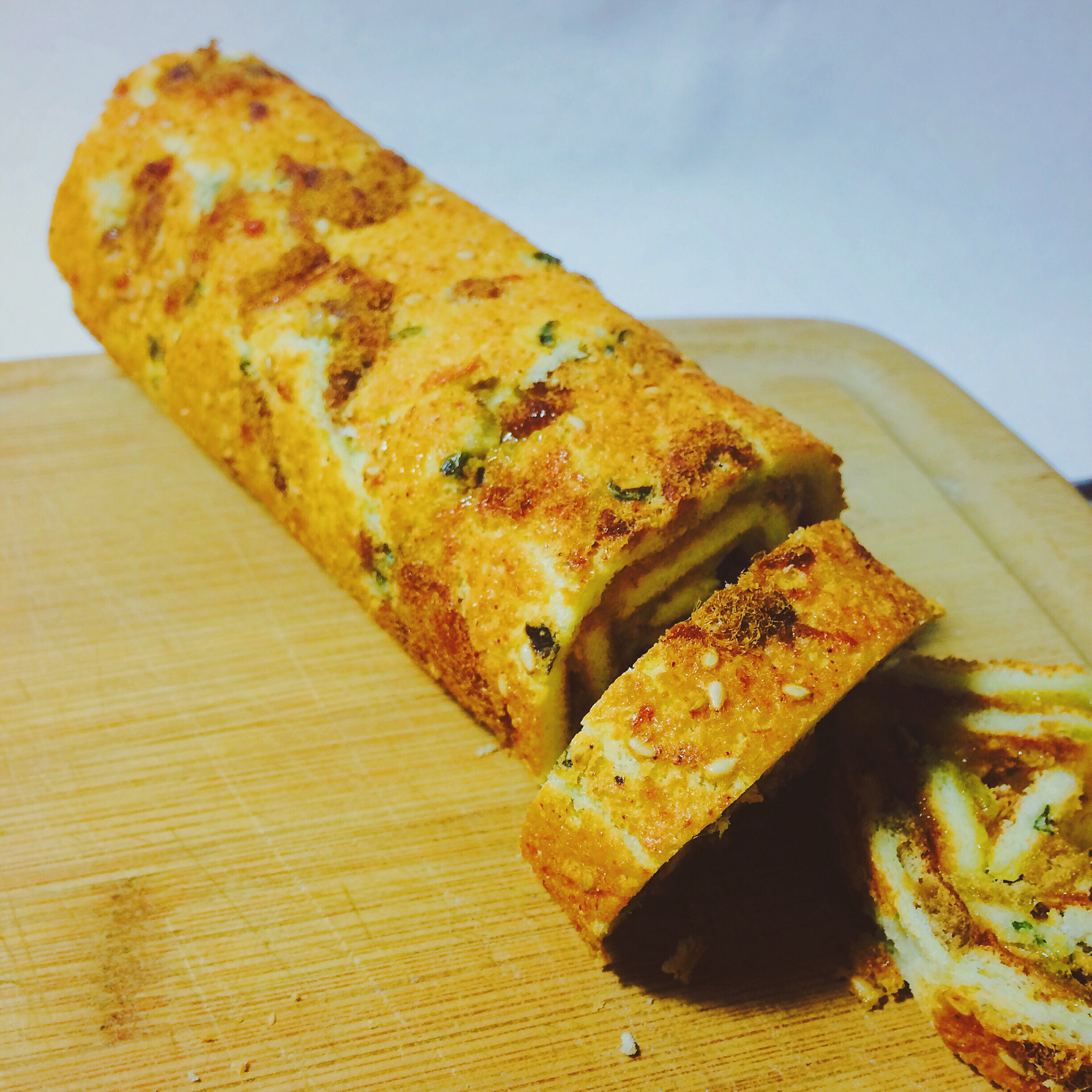 过来交作业了~肉松里撒了蒜粉鸡精和辣椒 夹层里也加了一点点蒜粒 沙拉酱是自己做的 自家烤盘太大 所以量把握得不好 烤太薄...