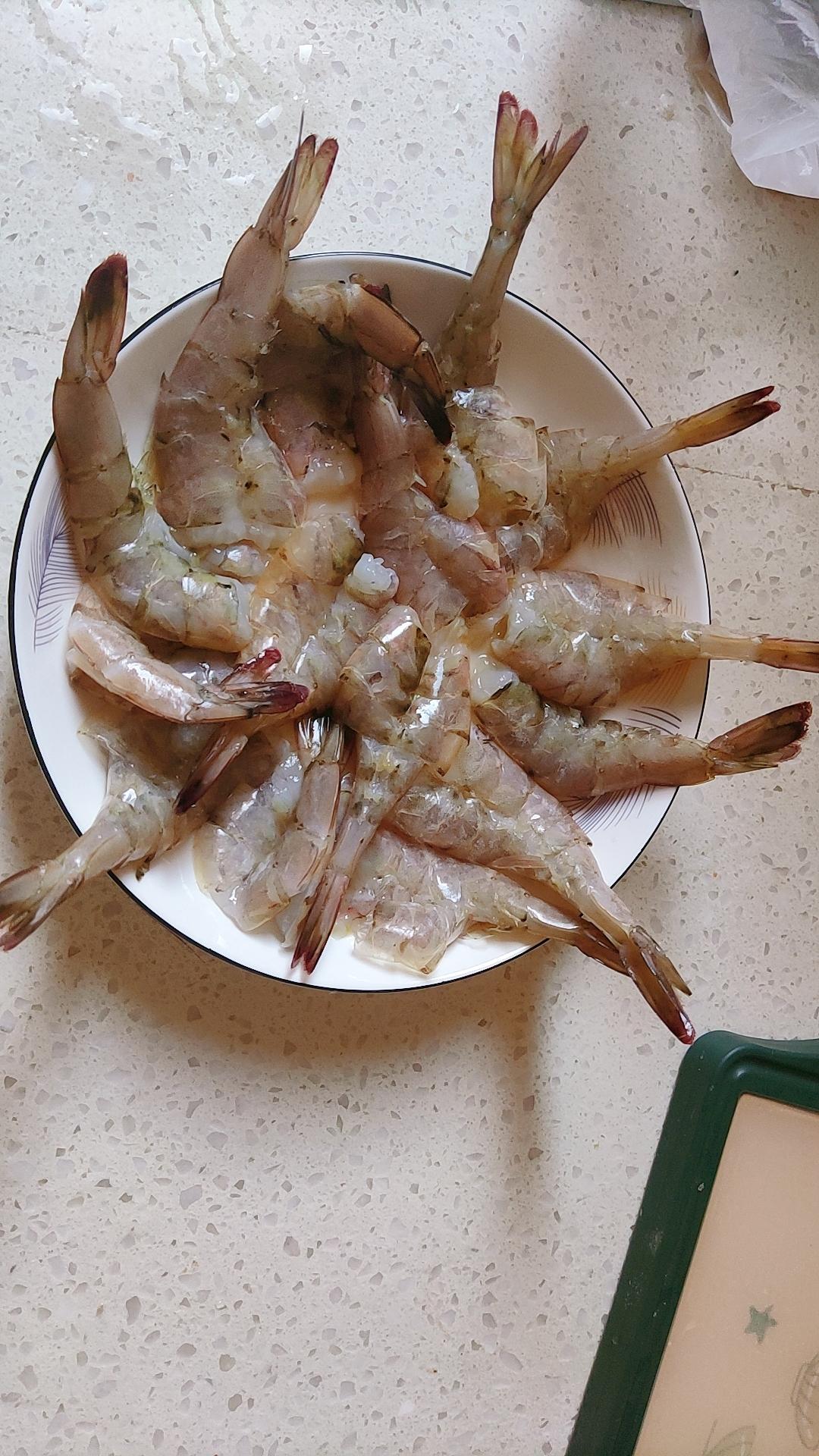 清洗,去虾头,去虾线,开背,把虾肉的一年倒扣在盘子里,用两勺料酒和一撮盐腌制,腌制一...