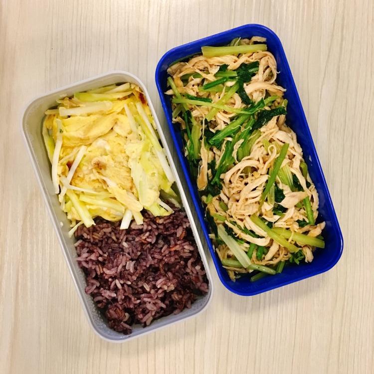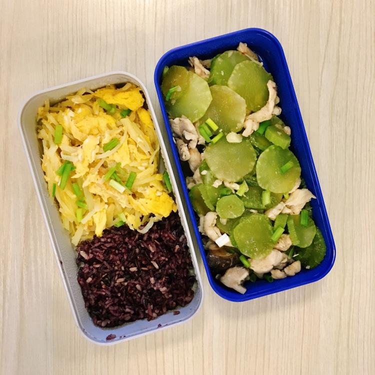 土豆丝炒蛋+莴笋炒鸡胸肉+紫米饭