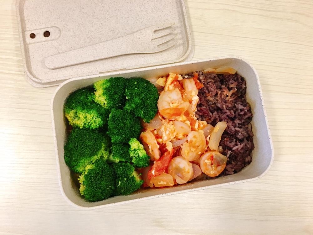 番茄鸡蛋炒虾仁+椰菜花🥦+紫米饭