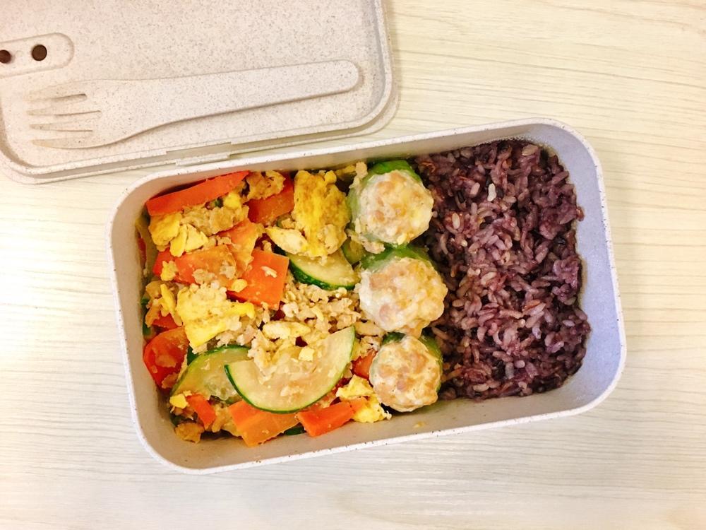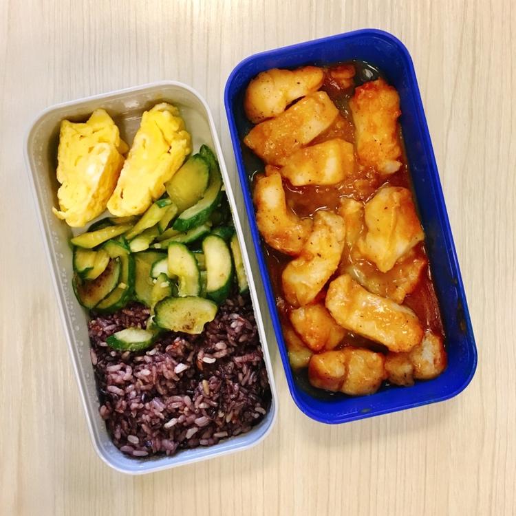 咖喱龙利鱼+芝士玉子烧+炒黄瓜🥒+紫米饭