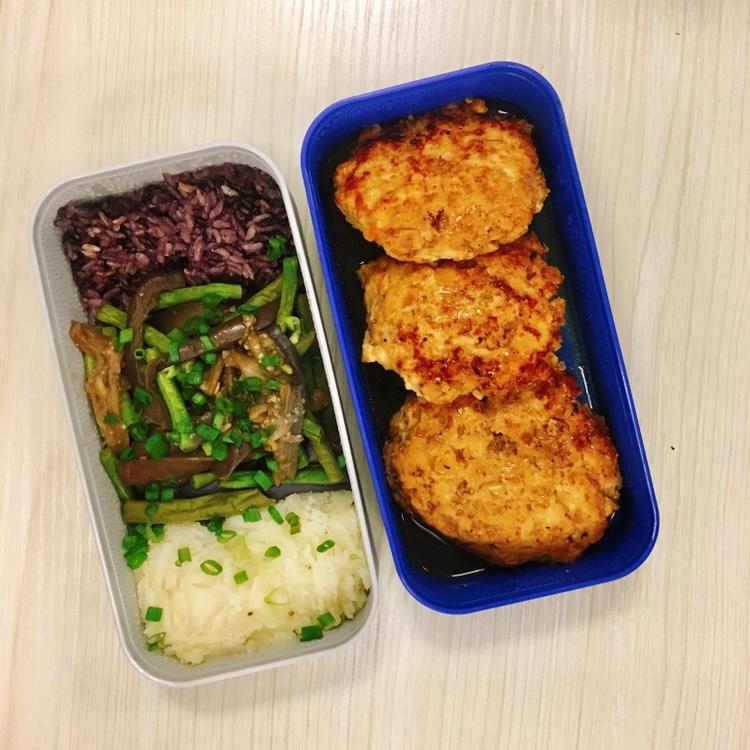 黑醋照烧鸡肉饼+茄子炒豆角+土豆泥+紫米饭