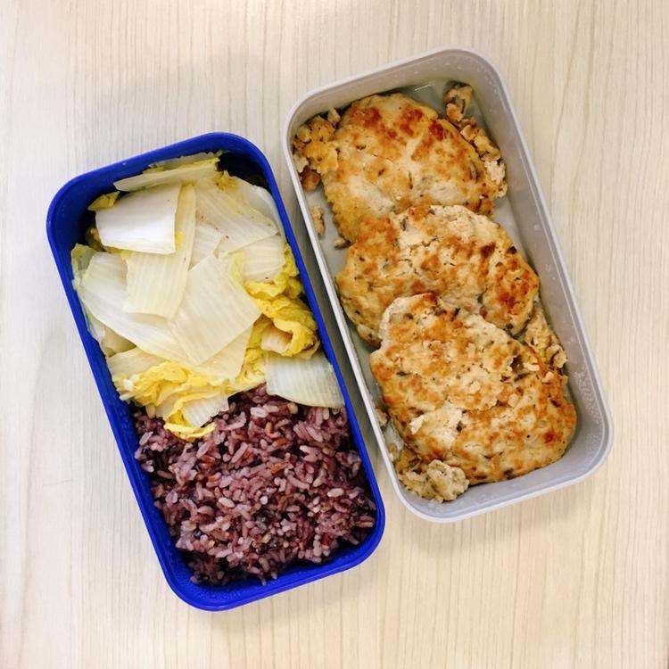 豆腐冬菇鸡胸肉饼+蒜茸娃娃菜+紫米饭