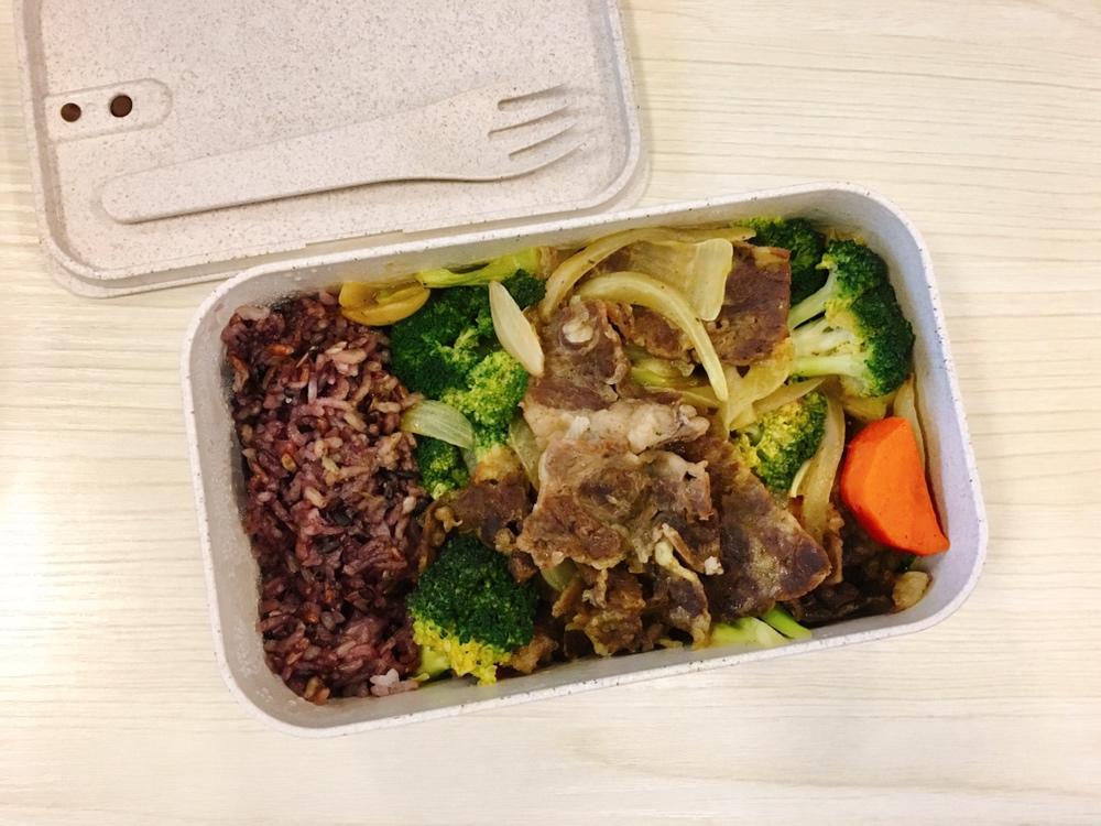 黑椒杂菇牛柳+云南小瓜炒鸡胸肉+紫米饭