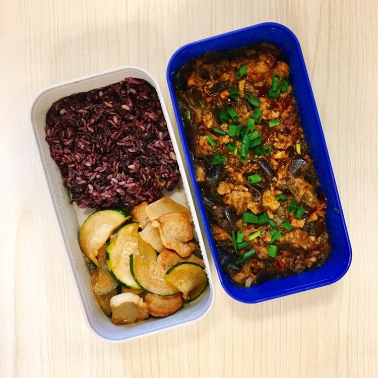肉沫茄子+节瓜炒猪肉+紫米饭